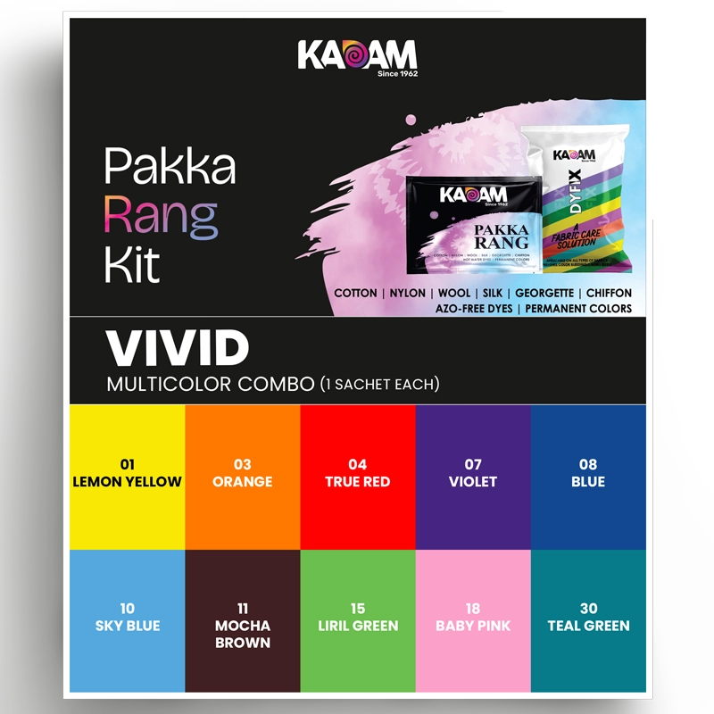 Kadam Pakka Rang makes fabric dyeing simple and fun! Itβs perfect for adding rich, vibrant colors to almost any fabricβexcept polyester or polyester blends. Whether itβs cotton, linen, jute, silk, georgette, rayon, wool, or other natural fabrics, our dyes are easy to use and deliver beautiful, long-lasting results. So go aheadβget creative and bring your fabrics to life!