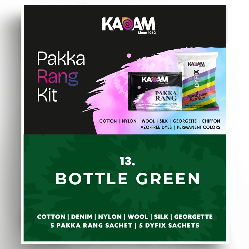 Kadam Pakka Rang Kit in Bottle Green, deep forest shade ideal for rich fabric dyeing; azo-free, permanent, 25g sachet.