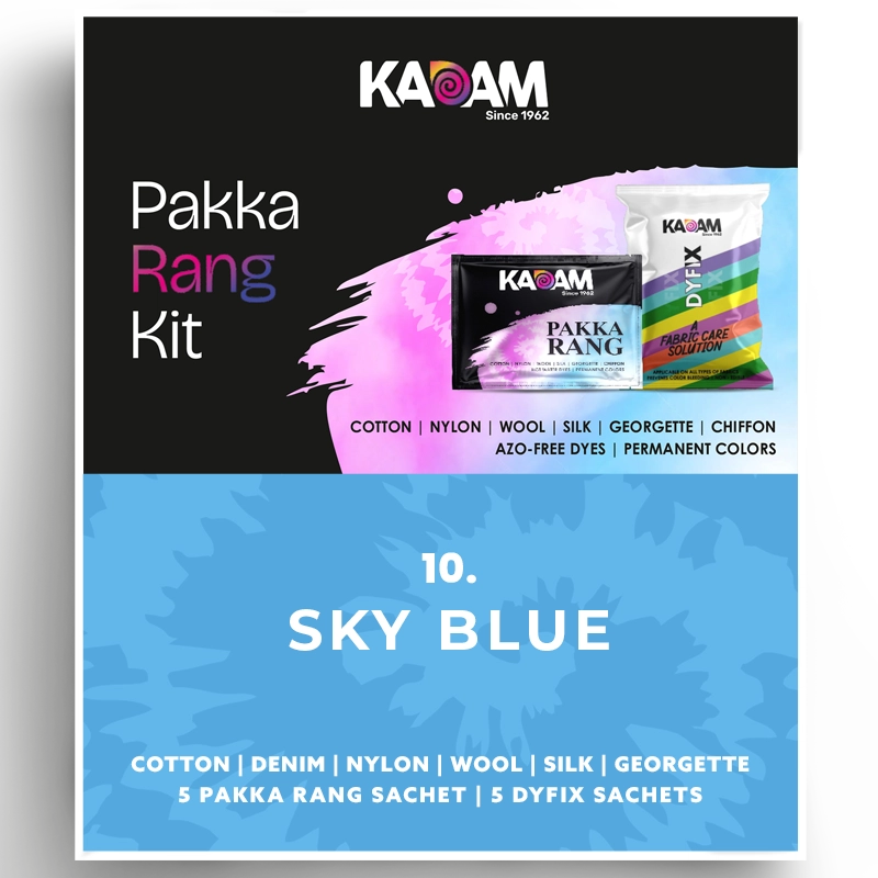 Kadam Pakka Rang Kit packaging with sky blue color option on a black and blue gradient background.
