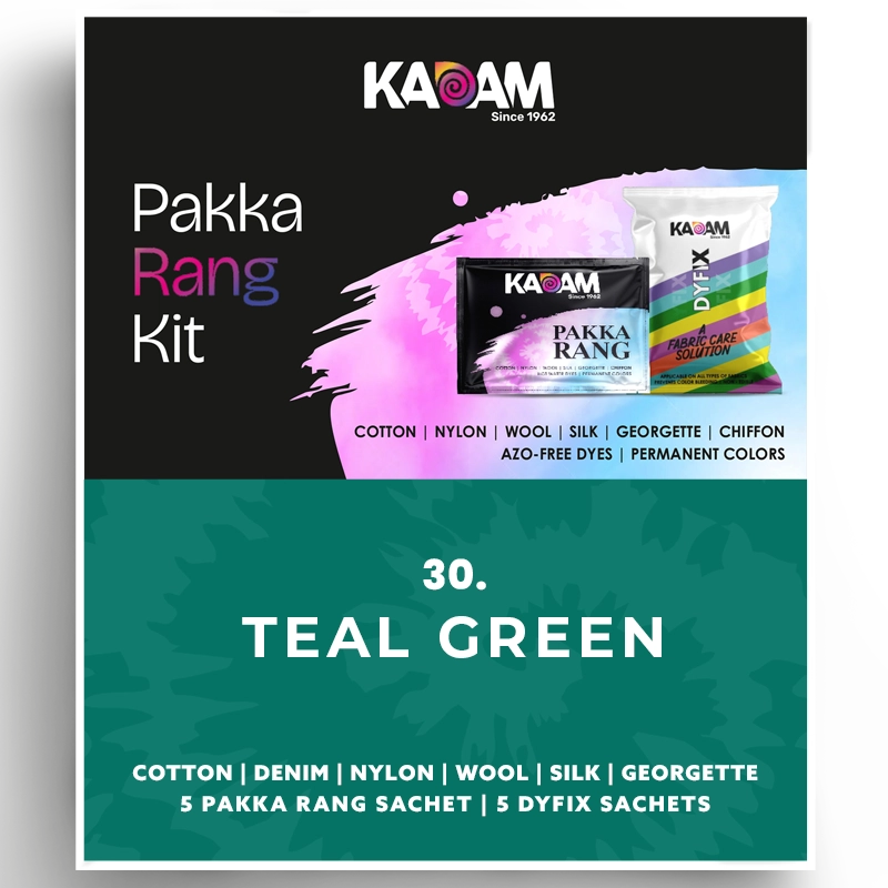 Kadam Pakka Rang Kit in Teal Green, vibrant fabric dye for natural and synthetic fabrics; azo-free and permanent, 25g color sachet.