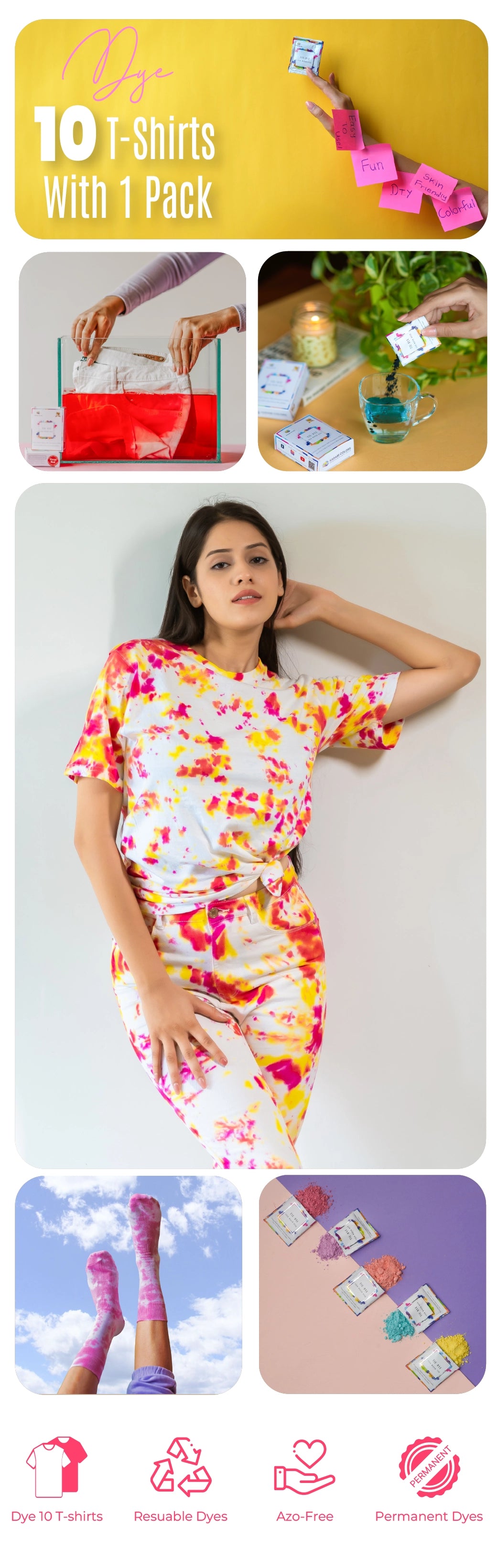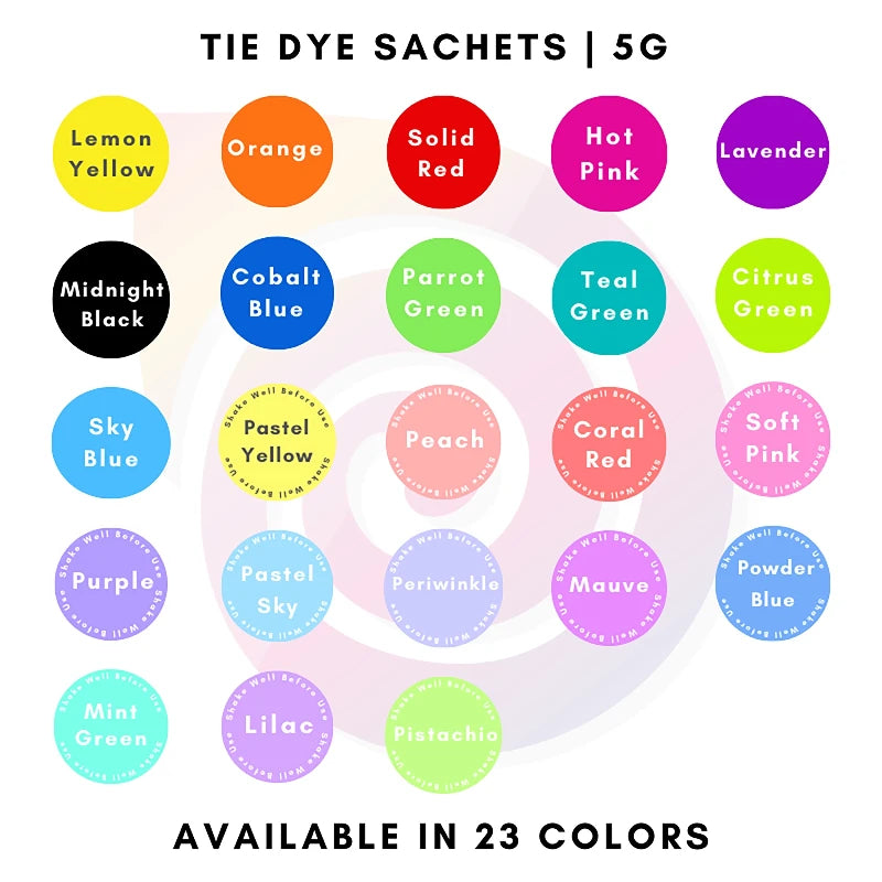 We offer 23 vibrant tie-dye colors to spark your creativity. Additionally, our Tie-Dye Kits are available in 21 unique combinations, thoughtfully curated from these 23 shades to suit every design need.